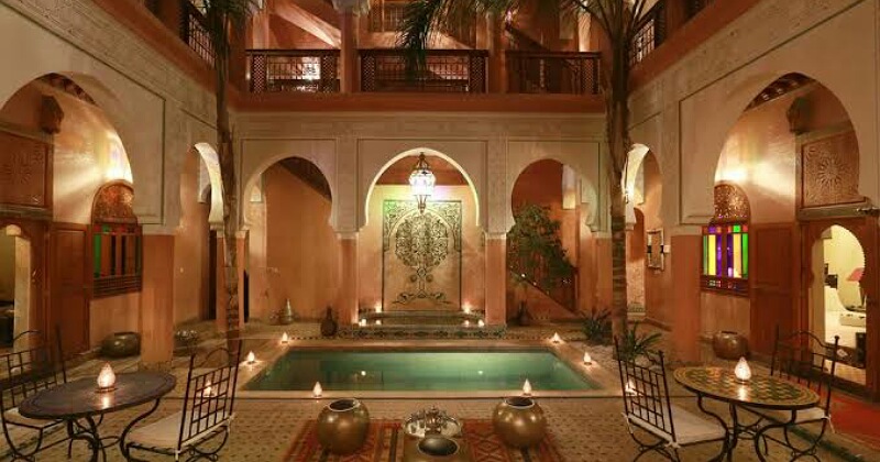 Rumah Maroko identik dengan keberadaan ruang terbuka luas yang biasanya ada di tengah-tengah bangunan. Area terbuka ini dikenal dengan sebutan Riad dan ini biasanya terdapat aneka tanaman, kolam atau air mancur kecil yang menciptakan suasana sejuk dan hidup.
